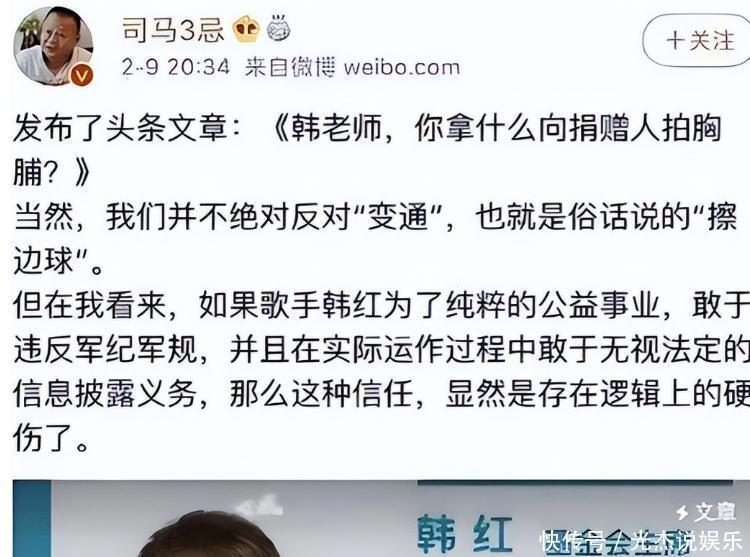今年九月份,韩红基金会又向西藏提供了价值960万元的医疗物资,包括30辆救护车以及支持300例白内障手术的项目。这些数字都是确实统计出来的,明明显示韩红真心在做慈善,也就理所当然地证明她一直在努力落实公益事业,可偏偏还是传出她“假慈善、贪污上亿”的消息。到2020年3月,微博上的“司马3忌”实名指控韩红基金会,有六个问题,涉及“贪污上亿”以及“3亿资金去向不明”,还附带一张韩红戴名表的照片,暗示这些慈善款就是用来买表的。